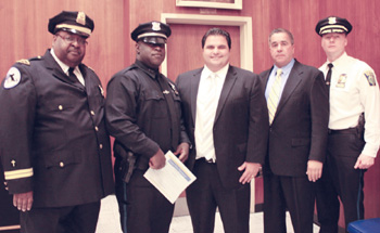 Mayor Carlo DeMaria Jr., (center) with Patrolman Jermaine Bellard, Chief Steven Mazzie, Bishop Robert G. Brown and Alderman President Joseph McGonagle.