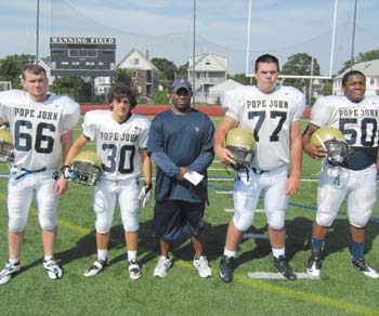 The Pope John High School football team has begun practice for the 2012 season. Head coach Brian Vaughan and the captains of the team are pictured before a scrimmage against Lynn Tech Saturday at Manning Field in Lynn. From left, are Robert Selfridge, Steve Hopkins, head coach Brian Vaughan, John Young and Judemario Joseph.