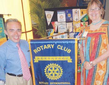 Everett Rotarian Rev. Barbara Smith-Moran was a guest recently at the Beijing, China, Rotary Club. She is greeted here by Beijing Club President David van Meerendonk. Rev. Barbara is Priest-in-Charge of Grace Episcopal Church on Norwood St. She and her husband, Harvard Astronomy Professor James Moran, were attending the International Astronomical Union General Assembly.