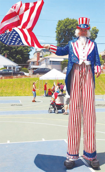 Uncle Sam waves the American flag during the City’s Independence Day party at Jacob Scharf Playground and Field last Saturday