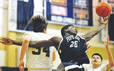 WORLD AT HIS FINGERTIPS: Jonathan Noel stretches for a rebound against Malden Catholic’s Jonah St. Clair (34) and Chris MacDonald. Pope John boys’ basketball has been on a tear, winning 10 straight until running into Malden Catholic last Wednesday, Feb. 10, and losing a heartbreaker, 67-65.