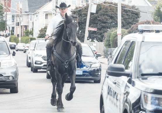 Gerry Scott rides Hercules up Edith Street to the Lafayette School with an escort from the Everett Police.
