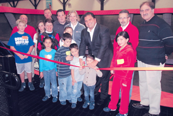 Mayor Carlo DeMaria Jr. joins Stella Downie, owner of Sky Zone Everett Indoor Trampoline Park, for the ribbon-cutting ceremony Saturday at the new facility located at 69 Norman St. Also taking part in the ceremony are Common Councilor Lorraine Bruno, Common Councilor-Elect Michael McLaughlin, Alderman Michael Mangan, and Jerry Berberian of Everett Place Group.