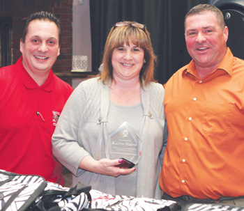 Karen Nalen was presented an award for outstanding service to the Everett Huskies organization at their annual awards banquet that was held Sunday at Silver Fox. Presenting the award were President Joe LaMonica (left) and Vice President Bill Marchante.