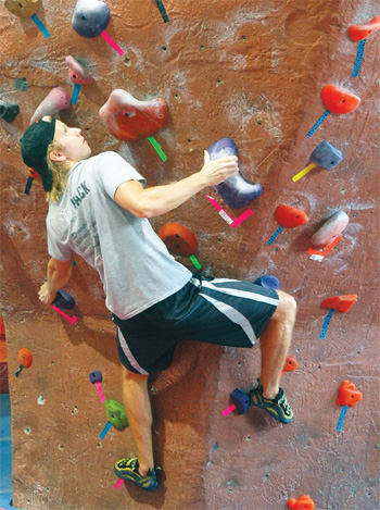 Ian Cross looks to make his next move on the climbing wall one day last week at Everett’s Metro-