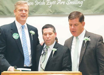 Governor Charlie Baker, Senator Sal DiDomenico, and Mayor Marty Walsh joined together in song to entertain the crowd during the annual St. Patrick’s Day celebration hosted by Sen. DiDomenico in Charlestown. The popular event brought many from the area and several state officials as well.