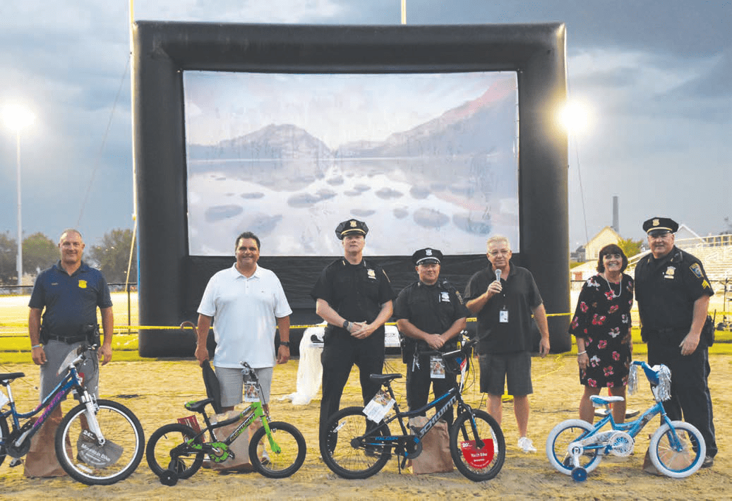 Community members and City officials came together at Everett Stadium on Thursday, July 22, for a Community Safety Movie Night – where residents were treated to safety information for pedestrians and cyclists, as well as bike helmets for kids and a free bike raffle giveaway. Following the festivities, the movie Space Jam was shown on the big screen. Mayor Carlo DeMaria, DA Marian Ryan, Chief Steve Mazzie and a host of officers helped to give away free bikes to lucky kids during the raffle.
