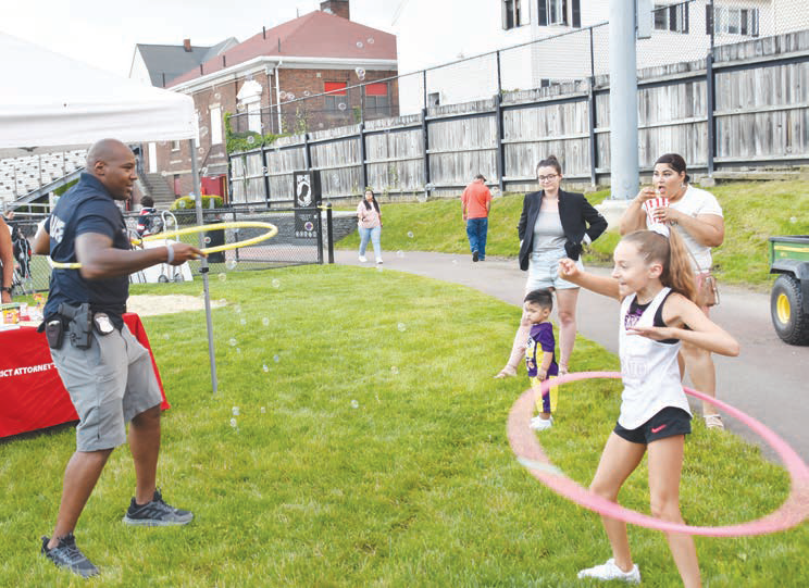Hula-Hooping with the kids is Officer Eric Williamson.
