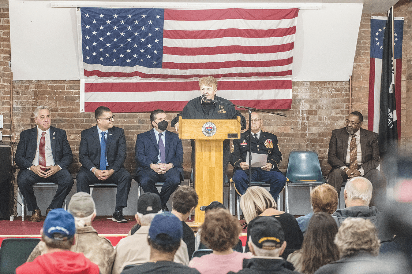 Veterans Commissioner Jeanne Cristiano speaks with dignitaries Massachusetts State Rep Joe McGonagall, Everett City Councilor Anthony DiPierro, Massachusetts State Senator Sal DiDomenico, US Army Command Sgt Major Thomas Ardita, and Bishop Robert G Brown of Zion Church Ministries seated behind her.