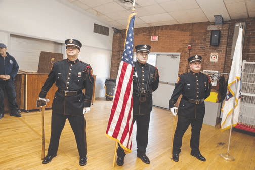 The Everett Fire Department Honor Guard: William Hurley, Kevin DeVanna, and Dan Lloyd stands vigil over the ceremony.